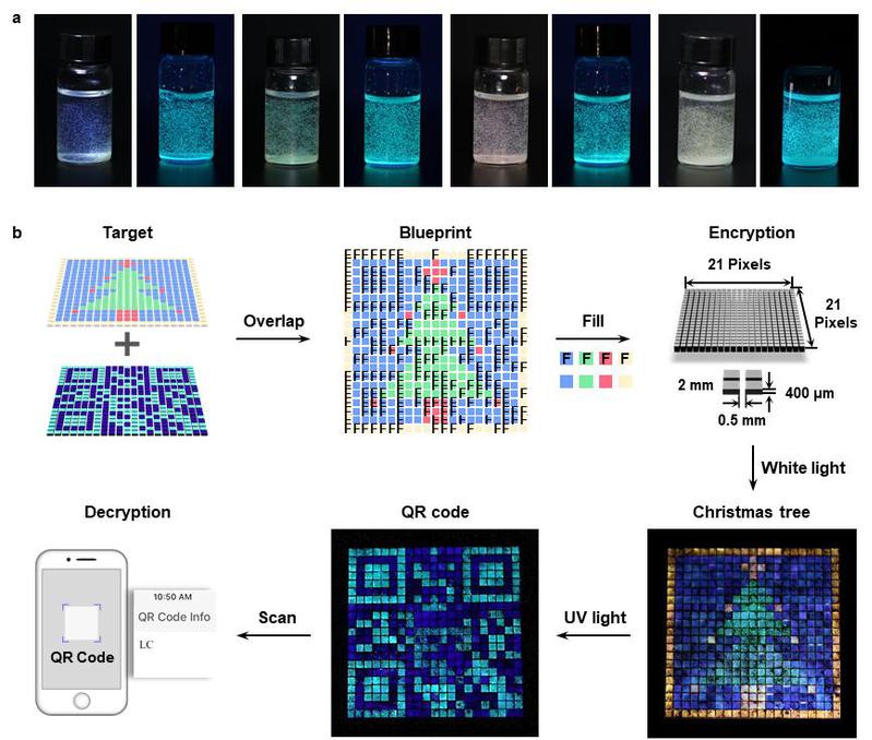 基于上述结构色可调、荧光性质稳定的“双色”微球,并结合只有结构色的“单色”微球,研究团队构筑了在反射和荧光模式下携带完全不同信息的双重标签,实现了信息加密的概念验证(图2b)。首先,确定标签需要展示的反射和荧光图案,例如,研究团队选择了圣诞树(反射图案)和二维码(荧光图案);然后,将两种图案重叠编辑成设计图;利用雕刻机加工出21 ´ 21的方格阵列,并根据设计图分别将对应颜色的8种微球填充进方格阵列中。该标签在白光下呈现精美的圣诞树反射图案,在紫外光下呈现青色的荧光二维码图案。利用智能手机扫描荧光二维码可以识别出被编码的电子信息“LC”(液晶Liquid Crystal的首字母)。此项研究成功地将由两种机理产生的颜色相结合,为保护真实信息提供了一种新的防伪材料,有望提高防伪力度并推动防伪技术领域的发展。