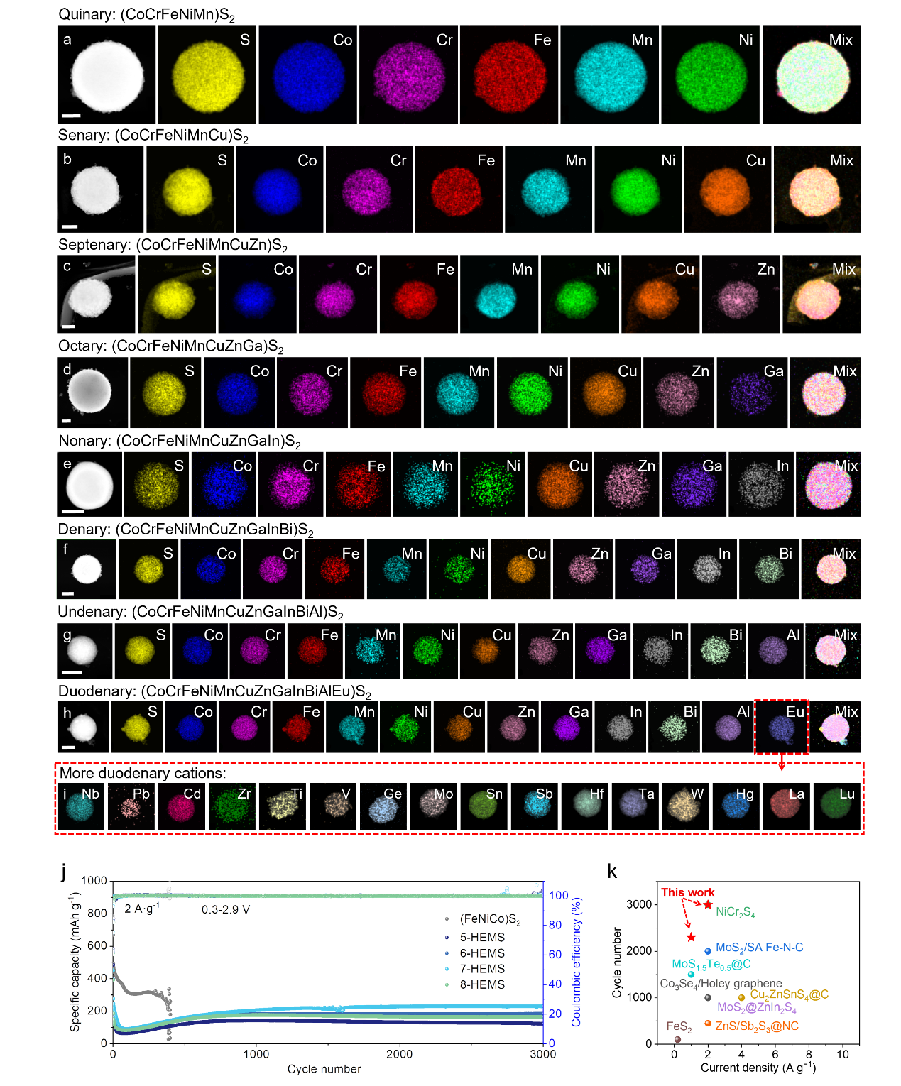 高熵金属硫化物(HEMS)材料凭借其独特的结构稳定性和组分可调性等优势,为高性能钠离子存储材料开发提供了新思路。高熵材料的固溶体结构可以保持元素均匀混合,有助于其在放电态下元素均匀混合不易团聚。然而,多组分高熵金属硫化物的可控制备与性能调控机制研究仍面临重大挑战。