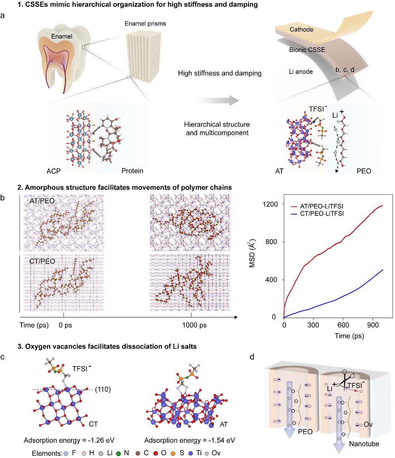近日,台湾a片 赵婕课题组和化学系李伟课题组在Angewandte Chemie期刊上合作发表了题为“Multiscale Engineered Bionic Solid-State Electrolytes Breaking the Stiffness-Damping Trade-Off”的研究论文。研究团队受牙釉质超结构的启发,设计并开发出一种由非晶TiO2纳米管阵列与聚合物电解质PEO交织而成的仿生复合固态电解质,实现了高刚度(杨氏模量达15 GPa,硬度为0.13 GPa)和优异的阻尼性能(tanδ=0.08),成功解决了传统固态电解质中刚度与阻尼难以兼顾的问题。一方面,这种电解质拥有媲美无机固态电解质的刚度,可有效抑制锂枝晶的生长;另一方面,其阻尼性能接近于聚合物固态电解质,确保了与电极的紧密接触。
