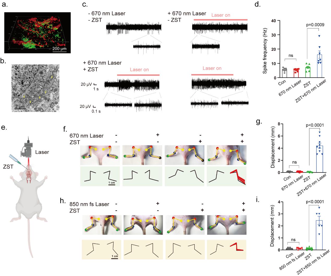受启发于染料敏化太阳能电池中的材料体系,研究人员将J-聚集态ZnTPyP和TiO2相结合,构建了一类新型的J-ZnTPyP@TiO2核壳异质结构:其中,功能内核J-ZnTPyP纳米棒可提供电子,外壳层TiO2可接受电子。作为电子给体的J-聚集态锌卟啉,分子间π-π堆积有利于Frenkel激子长程迁移,降低分子内激子湮灭效应,最大限度降低激子能量损失;同时,锌卟啉的J-聚集态可导致其吸收光谱红移,使其具备响应近红外光的潜力。而作为电子受体的外壳层TiO2,具有超快的电子转移能力,增加了电子的分离效率。电子注入TiO2导带后,形成还原型TiO2(e-),可通过非法拉第电容机制驱动细胞膜外的阳离子可逆吸附至其表面,形成亥姆霍兹电容,离子可在神经元界面重新分布,使神经元发生去极化而引发动作电位;值得一提的是,由于该过程无∙OH生成,避免了神经元损伤等副作用。同时,研究人员将该纳米光电容电极应用于生物学和临床前模型,在细胞层面,电极可与神经元紧密贴合,形成有效的生物电极界面,在670 nm安全激发功率密度下,可高时空分辨引起神经元产生动作电位;进一步,在可见光单光子和近红外双光子激发下,通过远场光调控小鼠运动皮层,增加了运动神经元的放电频率,实现了小鼠运动能力的增强。研究人员又将该电极注入到帕金森病模型鼠的丘脑底核,通过深部脑刺激,发现高频率的电刺激可以增加抑制性突触传递的频率,降低了丘脑底核的兴奋性,并且在黑质释放神经保护因子,避免了多巴胺能神经元的持续丢失,极大改善了帕金森模型鼠的运动能力。