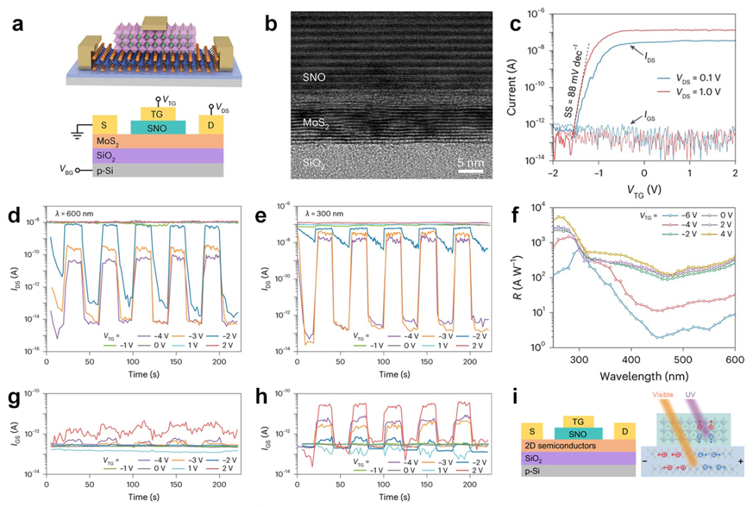 图2. 具有钙钛矿型氧化物Sr2Nb3O10顶栅结构器件的电学和光电性能