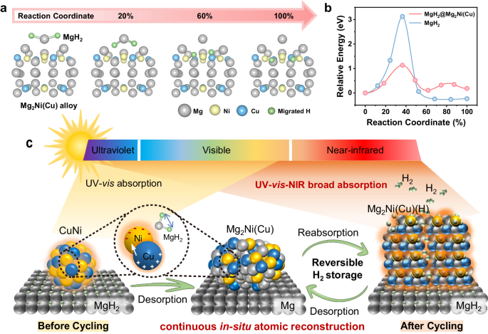 为解决传统热驱动储氢能耗过高的难题,团队基于光热与催化效应的高效耦合,提出了使用太阳能驱动高氢含量氢化物储氢。本工作通过在MgH2中引入CuNi纳米合金并借助脱氢反应实现原位原子重构,设计了一种单一组分相的Mg2Ni(Cu)三元合金以实现“光热-催化”本体化集成。Mg2Ni(Cu)的带内/带间跃迁机制实现了复合材料在全光谱范围超85%高吸收率。Cu和Ni的协同催化及光照下不平衡的光生热电子分布弱化了Mg-H键合,增强了“氢泵”效应并降低了脱氢反应能垒。
