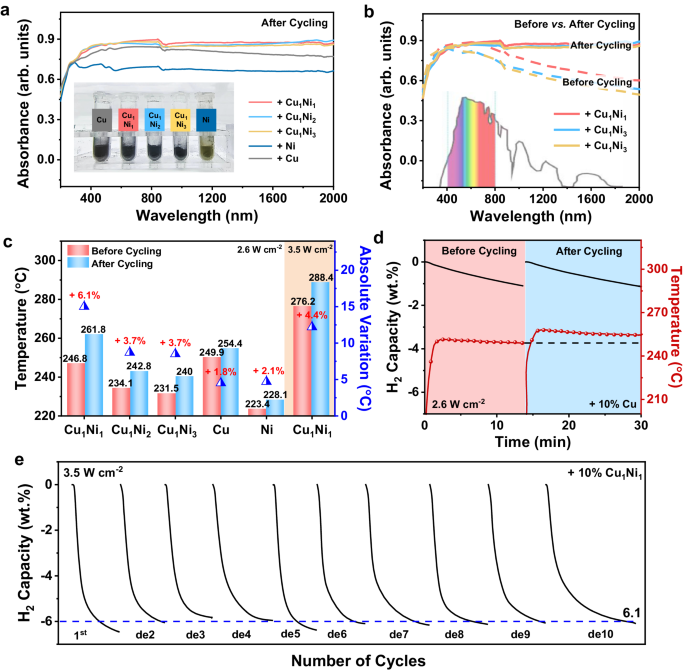图1 CuNi合金催化的MgH2光驱动可逆储氢性能