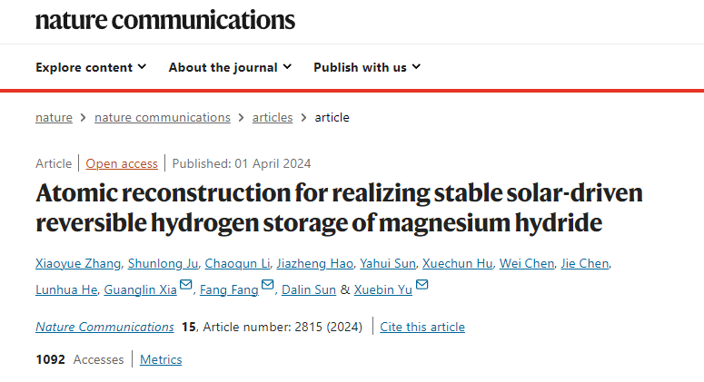 Xiaoyue Zhang, Shunlong Ju, Chaoqun Li, Jiazheng Hao, Yahui Sun, Xuechun Hu, Wei Chen, Jie Chen, Lunhua He, Guanglin Xia*, Fang Fang*, Dalin Sun, Xuebin Yu*. Atomic reconstruction for realizing stable solar-driven reversible hydrogen storage of magnesium hydride. Nature Communications, 2024, 15(1): 2815.