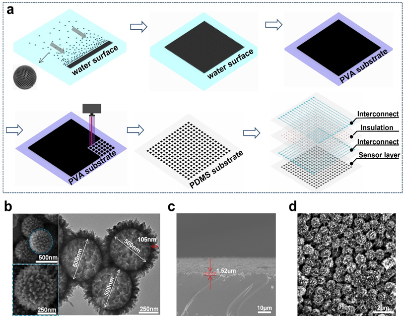研究人员将单分散的空心带刺纳米碳球通过利用马兰戈尼效应,在气液界面自组装成密堆积的薄膜,转移至PVA牺牲层后,利用激光烧蚀工艺可实现应变传感薄膜阵列化,再将其转移至PDMS表面保证可拉伸性,并利用点胶布线工艺完成薄膜的电气互连。