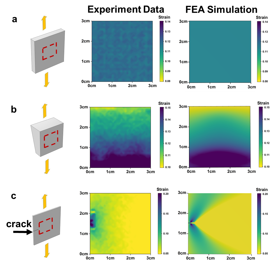 图3. 不同应变状态被测样应变分布监测与FEA验证
