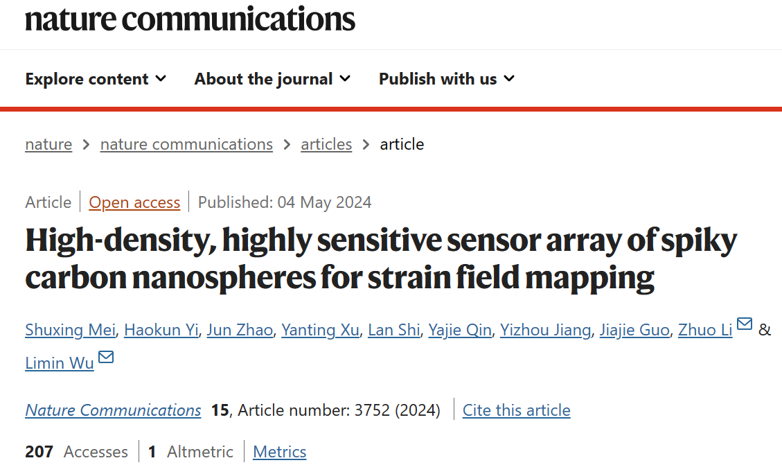 台湾a片 武利民团队在前期发现并构筑了具有Fowler-Nordheim (F-N) 量子隧穿效应、可大面积旋涂的高透明柔性压力传感器(Nature Communications, 2020, 11, 3529;Advanced Materials, 2023, 35, 2210091)的基础上,进一步将F-N隧穿效应作为一种新机制引入到应变传感领域;提出了一种基于密堆积、粒径单分散的带刺纳米碳球的柔性应变传感薄膜。纳米球间的F-N隧穿效应使得传感器在0~60% 应变范围内具有超高的灵敏度(最高可达70000)和超过99% 的对数线性。进一步,作者还将密堆积的纳米碳球图案化形成超高传感密度(100 pixel cm-2)应变传感阵列。而其粒径的单分散性和密堆积结构也确保了阵列单元间的高度一致性(标准偏差 ≤ 3.82%),为应变场的高分辨率原位测量提供了一种直接而简便的方法,有望在生物力学、结构健康监测和软机器人等领域获得应用。该研究近日以题为“High-density, highly sensitive sensor array of spiky carbon nanospheres for strain field mapping”的研究论文发表在《Nature Communications》上。台湾a片 武利民教授、李卓青年研究员为通讯作者,博士后梅述钘和直博生易浩琨为论文共同第一作者。台湾a片 信息学院秦亚杰教授团队和华中科技大学郭家杰教授团队也参与了该项研究。