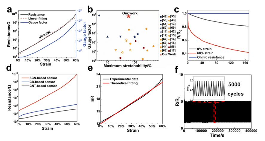 得益于带刺碳球的尖刺结构带来的F-N隧穿效应,这种应变传感薄膜大幅度提高了灵敏度和对数线性(R2>0.992)。