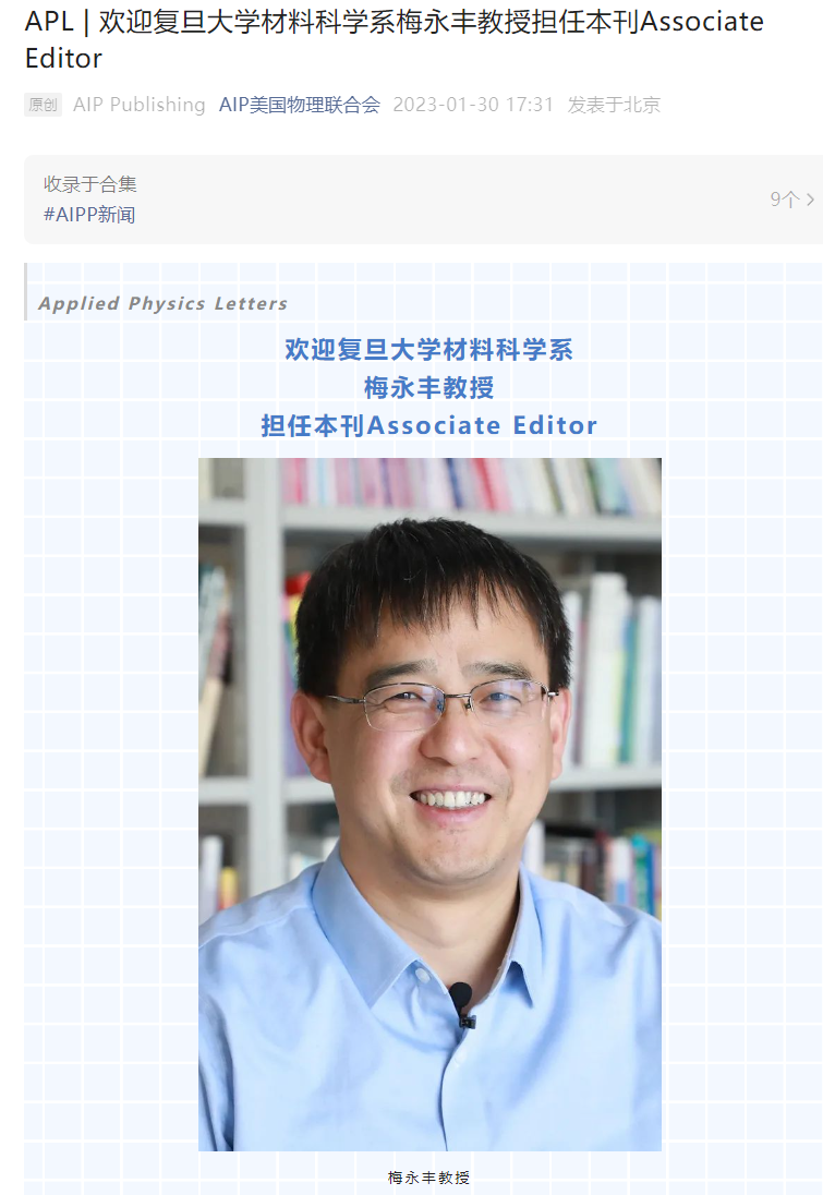 应美国物理联合会Applied Physics Letters期刊邀请,我系梅永丰教授自2022年12月起,担任该期刊副主编(Associate Editor)。梅永丰教授自2019年起受聘为该期刊顾问编委。
