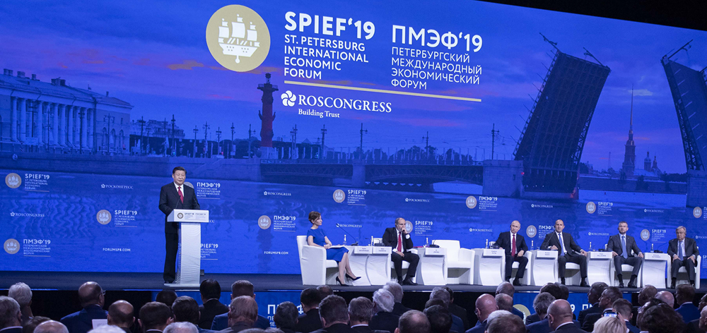 2019年6月7日,习近平出席第二十三届圣彼得堡国际经济论坛全会并致辞。习近平强调面对世界百年未有之大变局,中方愿同国际社会一道,合力打造开放多元的世界经济,努力建设普惠包容的幸福社会,致力构建人与自然和谐共处的美丽家园,携手开辟崭新的可持续发展之路。