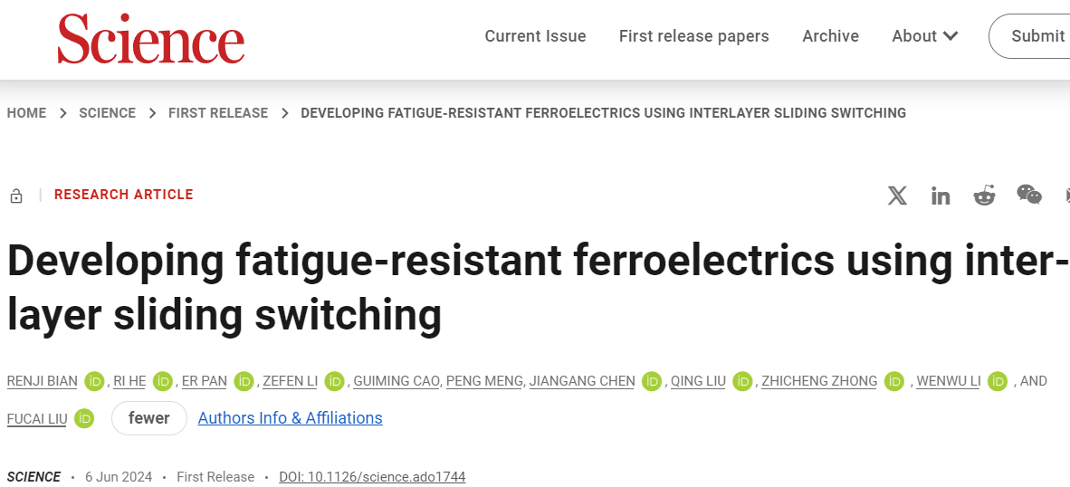 近日,台湾a片 李文武教授团队、电子科技大学刘富才教授团队以及中国科学院宁波材料所钟志诚研究员团队基于二维3R-MoS2滑移铁电材料,联合提出一种性能优异的抗疲劳铁电系统。2024年6月7日,相关研究成果以《抗疲劳滑移铁电体的发现》(“Developing fatigue-resistant ferroelectrics using interlayer sliding switching”)为题于《科学》(Science)主刊在线发表。该研究为解决铁电材料领域长期存在的疲劳问题提供了一种全新途径,有望推动该材料在铁电存储器及类脑智能芯片等方面应用。