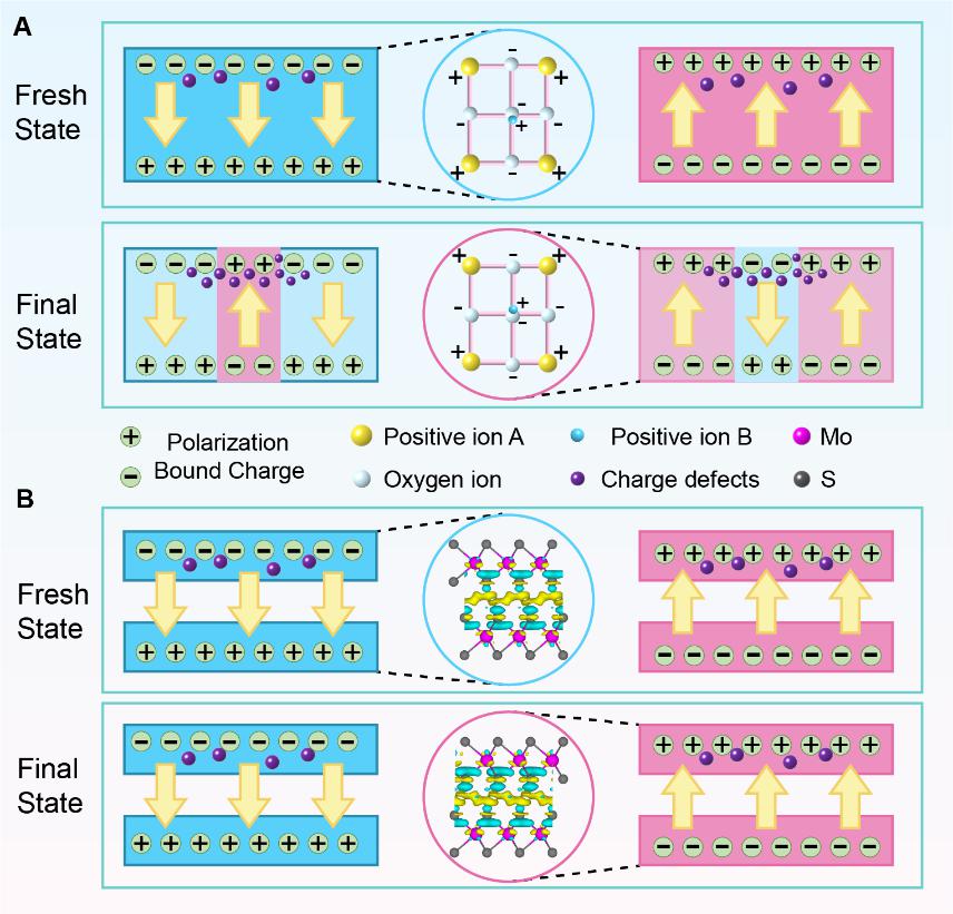 铁电材料内部有无数个晶格单元,每个晶格单元内都聚集了带电离子,同时也存在很多缺陷,这些带电离子在电场的作用下会移动,进而产生铁电极化翻转。在电场作用下,铁电材料中的每个晶格单元的极化翻转不是同时发生的,而是如同海浪一般从材料的一端传播到另一端。在传播过程中,材料中的缺陷会随传播而移动并聚集,久而久之聚集成为缺陷团簇,并对铁电畴有强烈的钉扎效应,使得铁电畴的移动活性被限制,极化就难以翻转,进而导致铁电器件疲劳失效。