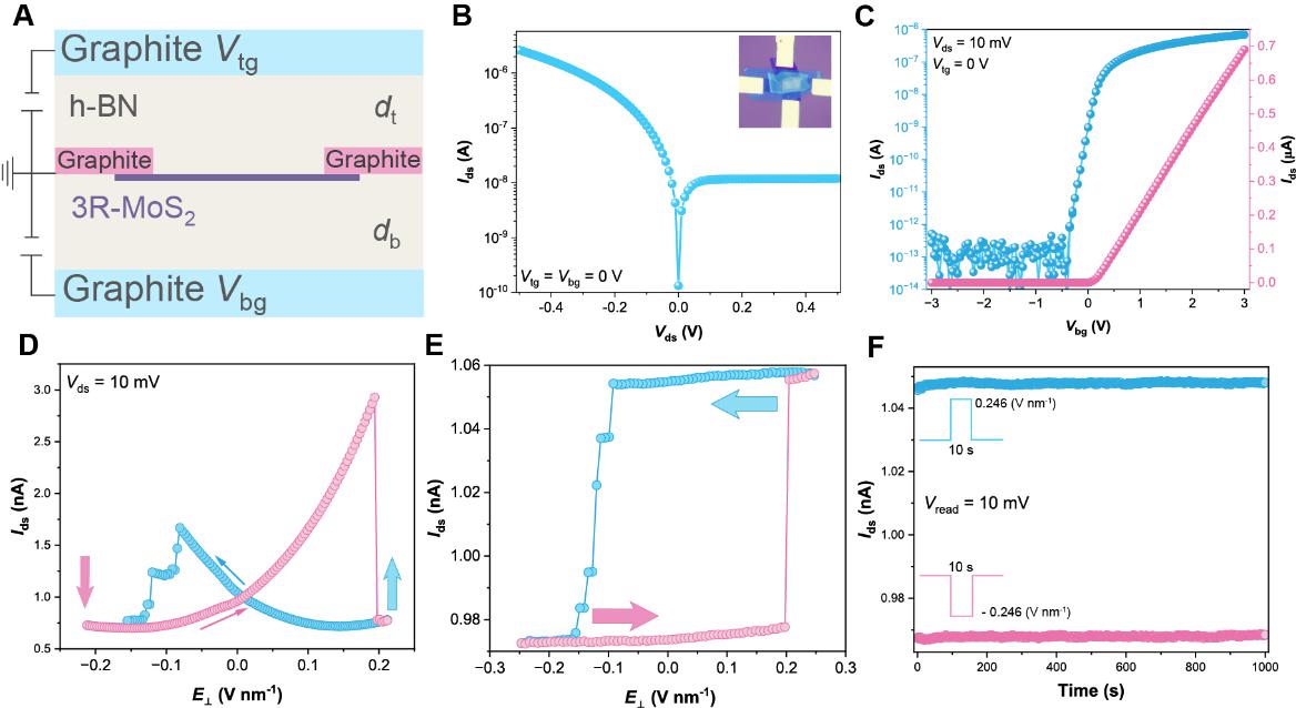 图3. 二维3R-MoS2铁电晶体管器件的电学特性