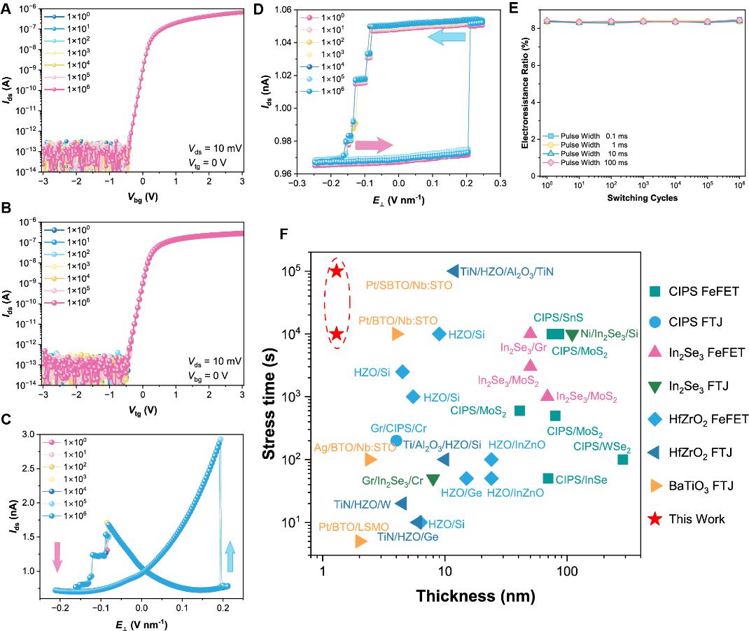 器件表征结果显示,滑移铁电器件在经历高达400万次的疲劳测试后,晶体管器件的转移特性曲线、动态及静态电学输运曲线几乎不发生变化。这一结果表明铁电极化并没有发生任何衰减,抗疲劳性能明显优于传统离子型铁电材料。跨尺度原子模拟计算表明,二维滑移铁电材料,没有原子的独立移动,而是两层原子像两张纸一样整体滑动。但是由于原子层间滑移无需克服离子键或共价键,在很小电场作用下,滑移铁电即可通过层间滑移实现极化翻转,如此小的电场不足以造成带电缺陷迁移。此外,由于二维材料的范德华层状结构,缺陷难以跨越层间进行移动,也更加难以聚集,因此不会产生铁电疲劳。