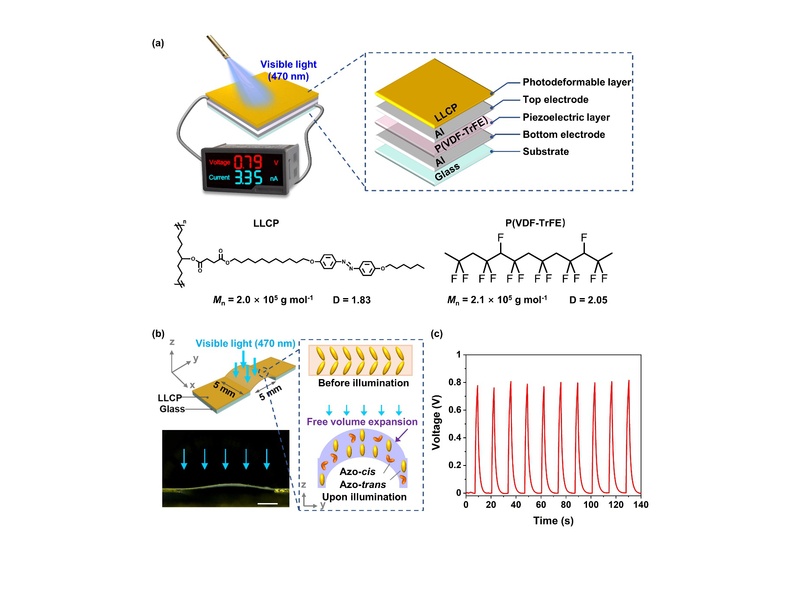 图1. (a)人工光感受器的结构和组成成分结构式,包括液晶聚合物LLCP和压电聚合物P(VDF-TrFE)。(b)液晶聚合物薄膜光致形变的示意图和照片。(c)人工光感受器的开路电压。