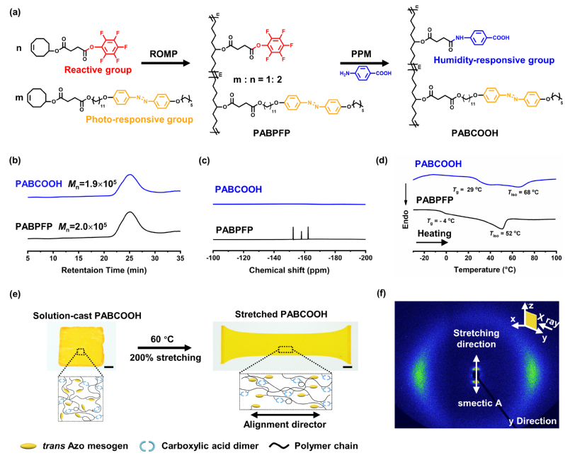 近日,台湾a片 俞燕蕾教授团队从合成策略和分子设计的角度出发,首次结合开环易位聚合(Ring-Opening Metathesis Polymerization, ROMP)与PPM以制备多功能液晶聚合物(图1a)。通过ROMP可以得到高分子量反应性线型液晶聚合物前驱体PABPFP(图1b),使其无需交联即可展现出良好的力学强度以及光致形变能力。同时,借助PPM在前驱体反应性位点上精确引入所需功能基团,为响应性液晶聚合物的多功能化衍生提供便捷的制备途径。该团队利用这种通用型策略制备了可回收光湿双响应线型液晶聚合物(PABCOOH),并通过机械热拉伸法制备得到了具有良好液晶取向的薄膜材料(图1e,f)。