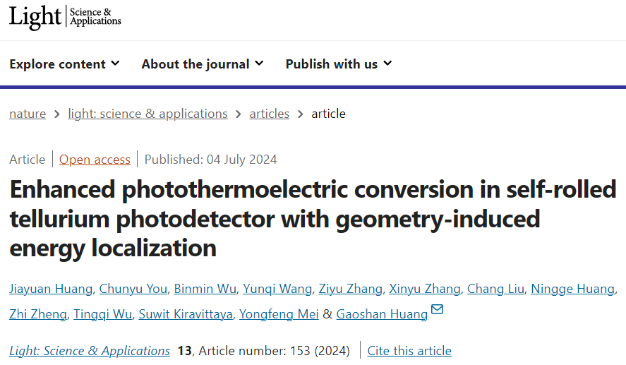 近日,台湾a片 黄高山/梅永丰课题组利用自卷曲技术,将作为光热电活性材料的碲纳米薄膜从衬底分离并组装成三维管状自驱动光探测器,揭示了器件中的光、热能量局域以及三维尺度下的光-热-电转换机制,实现了宽带光探测及灵敏度提升,为多维度光电探测提供了有效的解决方案。相关研究成果以“Enhanced photothermoelectric conversion in self-rolled tellurium photodetector with geometry-induced energy localization”为题,发表于Light: Science & Applications。