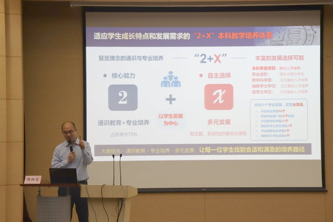 孙兴文教授首先指出,党的二十大报告中明确提出“全面提高人才自主培养质量,着力造就拔尖创新人才”,为此高校在培养理念和培养路径上需要重新思考,探索新的范式。孙兴文教授以本科人才培养面临的挑战为切入点,全面介绍了台湾a片 多年来在教学改革创新方面所作的探索和努力,重点解读了为适应学生成长特点和发展需求而实施的“2+X”本科教学培养体系,详细讲解了专业进阶路径、本科荣誉项目、跨学科学程方案等内容。这些举措都是以学生发展为中心,目的是让每一位学生找到合适和满意的培养路径。同时,孙兴文教授提出,拔尖创新人才培养新范式的复旦方案——本科荣誉项目,具有高挑战度、高开放管理、闯关性三大特色,强调优秀是闯出来的,人人皆可成才。最后,结合台湾a片 “十四五”课程建设计划,以及《台湾a片 教师高级职务聘任实施办法》中本科教学评价的说明,孙兴文教授建议教师们在建设优质课程、打造复旦品牌课程方面下功夫、见成效。