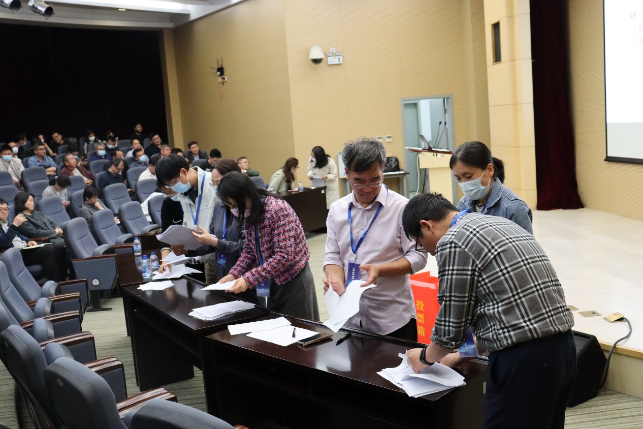 随后进入会议第二项议程。于瀛宣读了第九届工会委员会委员候选人名单和选举工作小组名单,并简要介绍了本次工会换届选举的程序和办法。本次选举以无记名投票方式进行,从11位候选人中差额选举出9位新一届工会委员会委员。在座所有工会会员鼓掌通过后,选举工作小组分发选票,会员收到选票后认真地在心仪的候选人名字后面勾选,并依次走向投票箱郑重地投下选票。