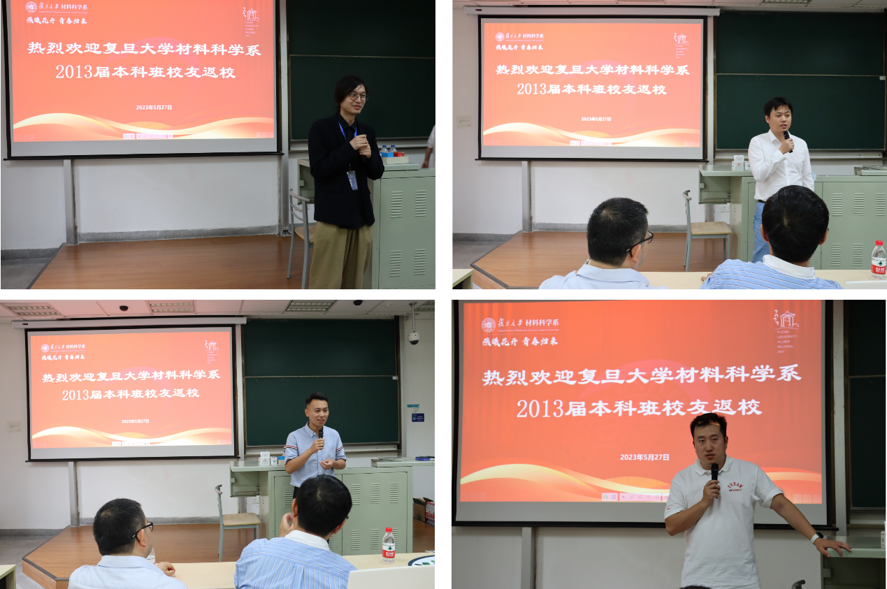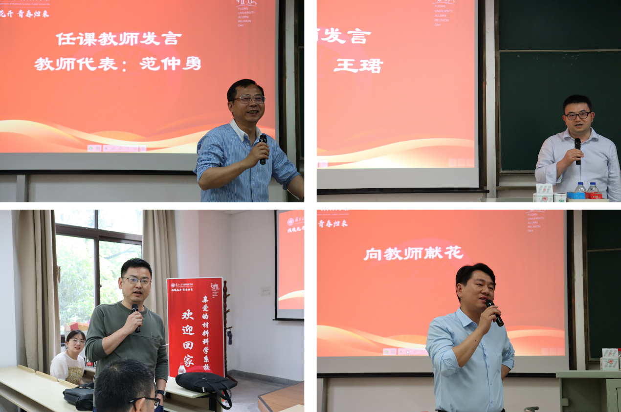 校友们发言结束后,范仲勇老师和王珺老师作为任课教师代表致辞。范仲勇老师曾给13届校友们上过《高分子物理》,王珺老师上过《数学物理方法》。毕业多年,校友们仍对两位老师当时的授课场景印象深刻,返回母校,他们表示也想见见这两位老师,以表达对他们当年殷切教导的感激之情。范老师和王老师表示,每位校友在各行各业的发展和成就值得欣慰,希望大家常回家看看,牢记“相聚是缘,材料是家”,鼓励大家作为复旦的学生,在工作中要有信心,同时也要不忘初心,才能在未来的人生中走得更高更远。副系主任倪峰老师和系党委副书记王珏老师也向校友们表达了热烈的欢迎和亲切的问候,并衷心地感谢大家长期以来对台湾a片 的关心和支持。