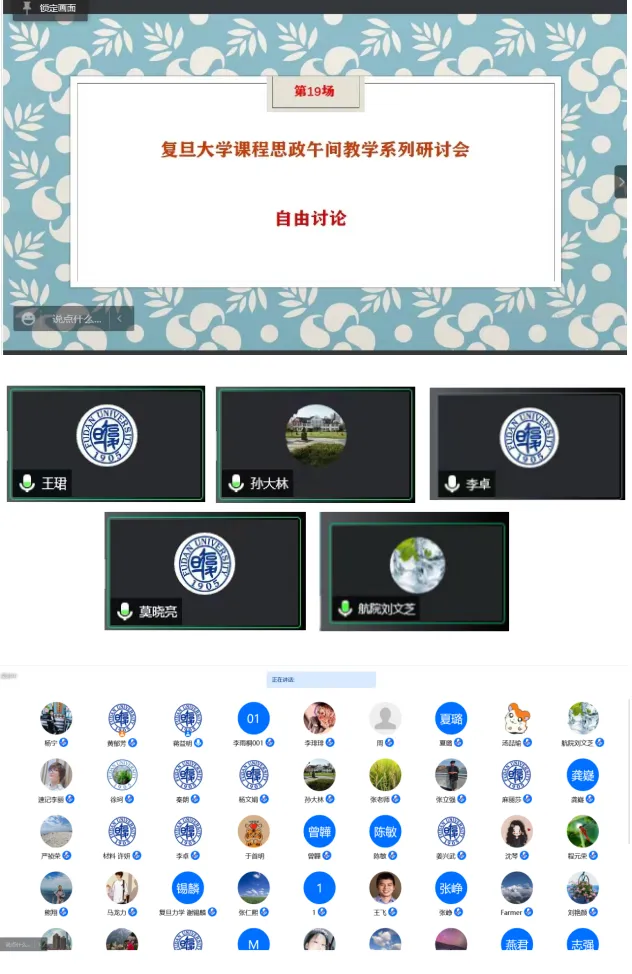 在自由讨论环节,各位老师围绕“基础理论课程如何更好地融入思政元素”、“在专业课程学时有限的情况下,如何兼顾课程思政和专业教育协同高质量建设”“如何做好研究生课程思政教学”“全国各高校课程思政建设各有哪些特点和可借鉴之处”等问题进行交流探讨。