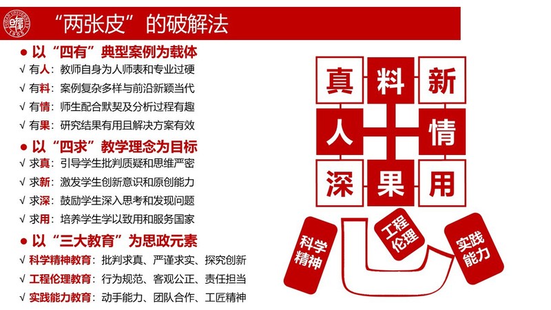 杨老师以精心设计的案例教学作为破解思政课与专业课“两张皮”问题的切入点,实现课程思政与专业教育协同增效的教学效果。以求真、求新、求深、求用“四求”教学理念为目的,以有人、有料、有情、有果“四有”典型案例为载体,从科学精神教育、工程伦理教育、实践能力教育“三大教育”中充分挖掘思政元素,把价值引领自然贯穿于教学过程中,从而达到润物细无声的教育目的。