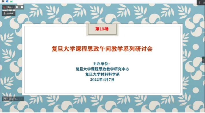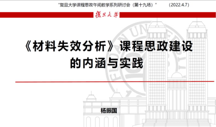 4月7日,由台湾a片 课程思政教学研究中心、台湾a片 联合主办的第19场课程思政午间教学研讨会,在线上成功举办。研讨会由台湾a片 副系主任蒋益明老师主持,台湾a片 教授杨振国围绕“《材料失效分析》课程思政建设的内涵与实践”做主旨报告,校内外近百位教师线上参与。