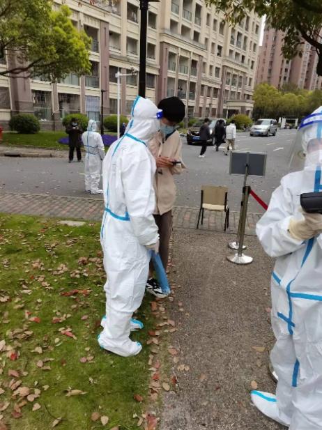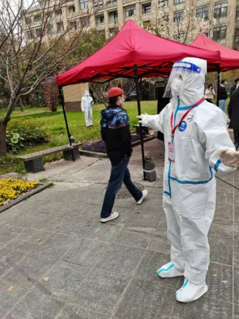 3月31日下午一点多我接到生活园区核酸检测需要志愿者的消息。我当时刚派送完楼层午餐,正在吃午饭,但是立马吃了几口就去协助核酸检测去了。天有不测风云,傍晚时分下起了雨,但是在同学们、志愿者和医护人员的共同努力下,检测工作依然有序进行。晚上八点多,我们顺利完成了园区所有人员的核酸样本采集工作。这是我第一次穿“大白”装,切身体会到了医护人员的伟大与不易,向他们表示最真挚的致敬与感恩。虽然“大白”装又闷又不时尚,但是它是抗击疫情过程中最靓丽的风景线,它代表着担当与责任、付出与牺牲、善意与无私。疫情无情人有情,相信在我们党和人民的共同努力下,我们会更有信心和决心击破疫情。