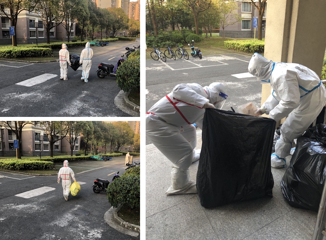 为了减少人员流动,避免交叉感染的风险,志愿服务队对整栋楼的生活垃圾进行集中收集,错峰投放。服务队在一楼设置了垃圾投放点,并且严格制定了楼层投放时间段。所有楼层的垃圾都投放完毕后,志愿者们开始对垃圾进行清理分类,并投放到生活园区的集中处理点。整个过程中,虽然不愿意和这些脏乱的生活垃圾打交道,但是为了整栋宿舍楼人员的健康和安全,志愿者们发挥党员吃苦耐劳的精神,认真负责地清理堆积的生活垃圾。