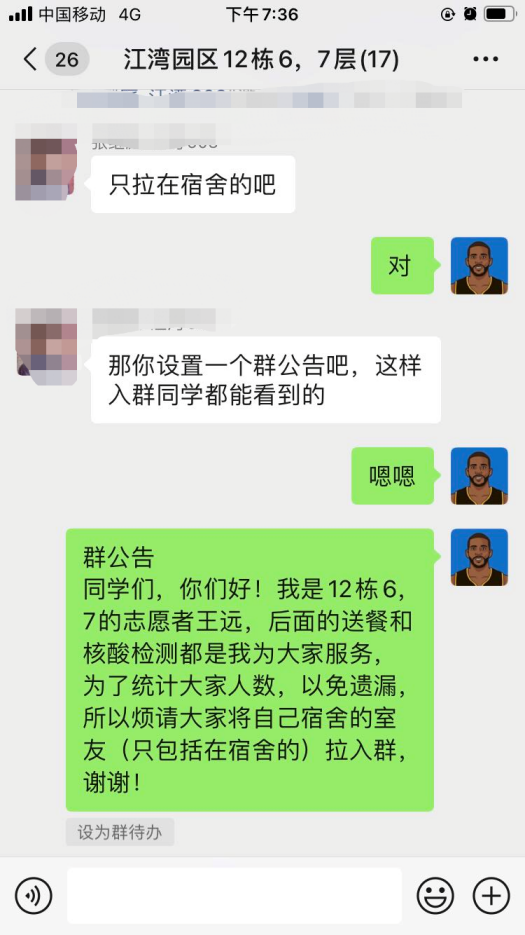 3月31日,根据上海市疫情防控要求,台湾a片 疫情防控指挥部紧急采取防控措施,要求江湾校区全体师生员工人不流动、足不出户,有序参加学校统一安排的核酸检测。为响应学校疫情防控要求,台湾a片 研究生第二党支部15名成员迅速成立“园区12号楼志愿服务队”,在临时楼宇负责人韩画宇老师的指导下,积极为12号楼115位同学承担起运送与分发盒饭、维护核酸检测秩序、垃圾清理与投放等日常生活服务,充分发挥党支部的战斗堡垒作用,面对特殊时期,拿出特殊精神,体现特殊担当。