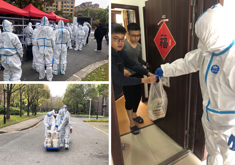 3月31日清晨6:00,在得知江湾校区急需一批党员同志承担12号楼的志愿服务时,研究生第二党支部的同志们丝毫没有犹豫,立刻整装待命。为了能够让整栋楼的同学们尽早吃上盒饭,志愿者们早早地在国政路门的取餐地点等候,两到三人一队,团结协作地将115份盒饭运送到12号楼一楼大厅。为了能够提高送餐效率和节约使用防护服,志愿服务队合理安排人员,采取了“楼层责任制”和“轮休制”。每一天有3-4名志愿者参与服务,三天完成一个循环。每一名志愿者都要负责两个楼层的盒饭配送,保证将盒饭亲手交到每一位同学手中,做到“不漏送”。志愿者在送餐服务过程中全程佩戴口罩,规范穿戴防护服,为整栋楼的同学们构建起一道安全牢靠的防护线。当看到楼栋宿舍群里的同学们由衷地向自己表示感谢时,服务队的志愿者们纷纷表示自己的辛苦是值得的!