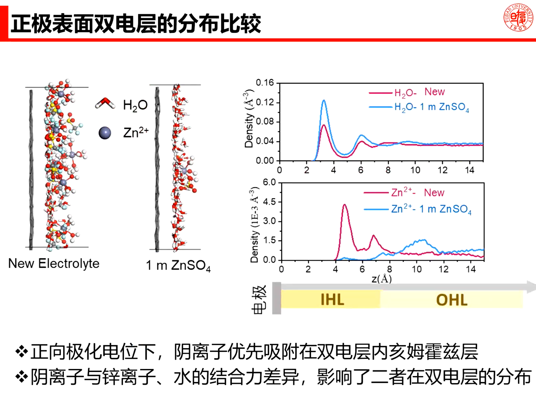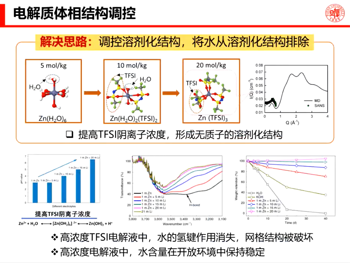 报告中,王飞老师就“电池电解液及界面”、“体相结构调控”、“双电层调控”、“中性锌空电池”等几方面研究内容的工作原理,以及面临的挑战和理论局限进行了讨论分析,并展望了本领域的发展趋势:“电解质成分-体相结构-双电层结构-界面性质的关系仍有待探索”。