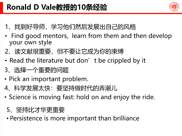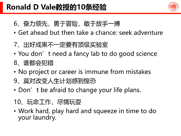 最后,王飞老师还结合自身学习心得向同学们讲述了应当以怎样的态度对待科研。他引用Ronald D Vale教授的经验向同学们分享了科研中最重要的10件事。