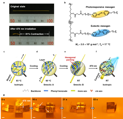 图1、(a) 470 nm光照下线型液晶聚合物纤维产生高达81%的收缩形变;(b) 线型液晶聚合物的分子结构;(c-f) 液晶聚合物纤维的超大光致收缩形变的机理示意图;(g) 470 nm光照下,正方形盒子的程序化和精确折叠照片,此时设定折叠角度为90°
