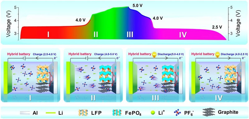 针对以上问题,研究团队采用廉价易得的石墨代替部分商业化正极材料磷酸铁锂,通过简单的机械球磨混合制备工艺,开发了一种基于磷酸铁锂/石墨复合材料的混合电极。类似于传统锂离子电池,在低工作电压(2.5-4.0 V)下,该混合电极可利用锂离子在磷酸铁锂内的嵌入/脱出反应进行能量储存。其次,与传统摇椅式锂离子电池不同的是,在高工作电压(4.0-5.0 V)下,电解质中的六氟磷酸根阴离子还可以在石墨内进行可逆的脱嵌/嵌入反应,从而同步提高了电极材料的比容量与工作电压,大幅提高了电池的能量密度。当与商业化的石墨负极组装成全电池后,混合电极的宽电压范围和高容量可将全电池的能量密度提高至约176.7 Wh kg-1,远高于以石墨和磷酸铁锂分别为负极和正极的商业化电池(~100到130 Wh kg-1)。
