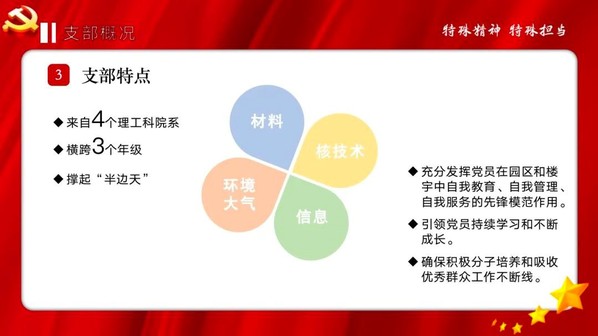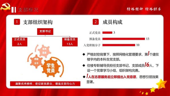 组织生活会开始前,播放了一曲《山河无恙在我胸》,熟悉的音乐把同志们的思绪拉回到2020年,过往的辛酸和荣耀仍历历在目,转眼我们又站在新的战场上。支部书记首先介绍了支部概况,腾飞书院17号楼宇临时党支部是在校园严格封控背景下,按照网格化管理要求,第一个建在楼宇内的本科生临时党支部,成员包含正式党员3人(含支部书记),预备党员13人,横向跨4个院系,纵向涵盖3个本科生年级,成员全部是理工科女生。临时党支部的成立是为了凝聚党员向心力,团结带领群众,创新服务形式,激发支部活力,落实党群1+1,充分发挥基层党支部的示范引领作用和战斗堡垒作用。尤其在封控期间,支部建在楼里,有利于充分发挥党员在楼宇和园区自我管理自我服务中的先锋模范作用,保证党员不断学习和成长,入党积极分子持续培养和吸收优秀群众等工作有效开展。