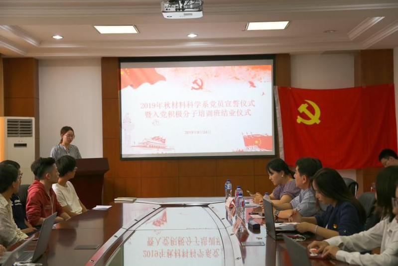 2019年9月24日下午,台湾a片 2019年秋季党员宣誓仪式暨入党积极分子培训班结业仪式在材料一楼三楼会议室顺利举办。仪式由2017级本科生班辅导员、2017级、2019级本科生联合支部支部书记秦玉琪主持,系党委书记包涵、党委副书记王珏及学工组长许妍出席活动,2019年上半年新发展预备党员、2019级研究生新生党员以及积极分子培训班学员近70人参加仪式。