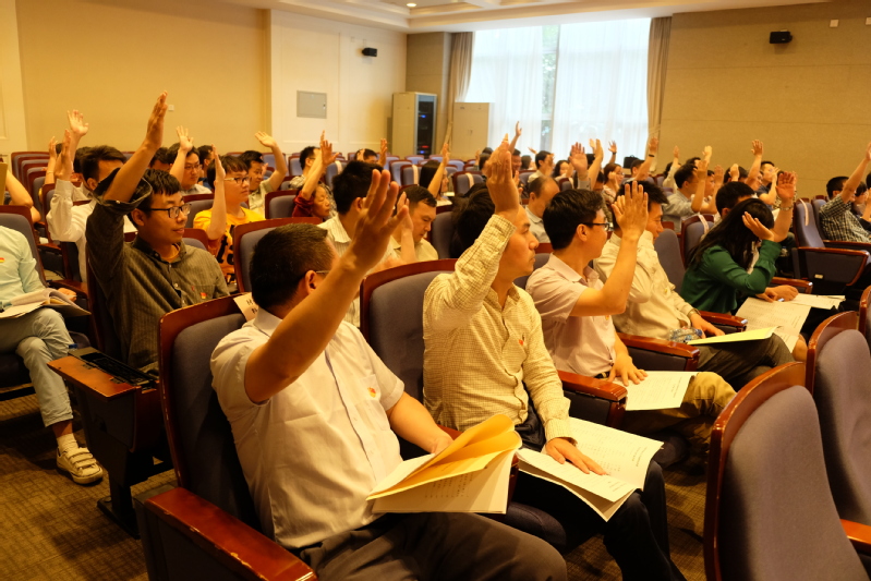 总监票人许妍同志向大会报告最终计票结果。(以姓氏笔画为序)王珏、王珺、包涵、孙大林、梅永丰、龚嶷、蒋益明等7名同志当选为中共台湾a片 新一届委员会委员。在雄壮的国际歌歌声中,中共台湾a片 党员代表大会圆满结束。