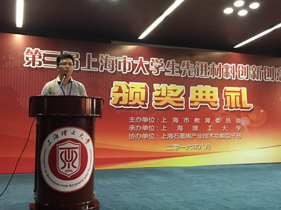 8月25日,由上海市教委主办的“第三届上海市大学生先进材料创新创意大赛”决赛在上海理工大学举行。我系研究生陈阳团队“一种纳米TiO2/生物炭锂(钠)离子电池负极材料”和本科生任泽威、高旺团队“基于喷墨打印的柔性钙钛矿太阳能电池”双双荣获一等奖,指导教师分别为崔晓莉教授和梁子骐教授。任泽威作为获奖学生代表在颁奖典礼上作了发言。