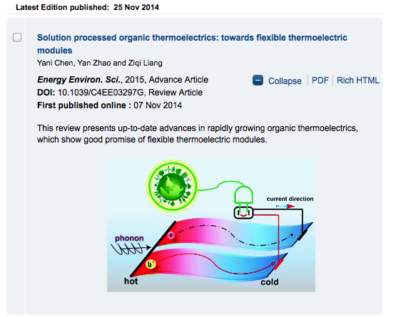 Solution processed organic thermoelectrics: towards flexible thermoelectric modulesYani Chen, Yan Zhao and Ziqi Liang*, Energy Enviro Solution processed organic thermoelectrics: towards flexible thermoelectric modules