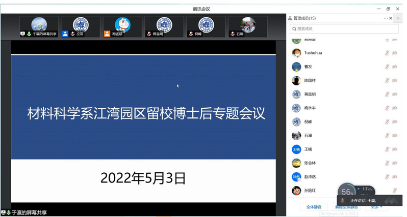 特殊抗疫课堂,博士后要强信念显担当。5月3日晚,在江湾园区留校博士后专题会议上,党委书记于瀛结合江湾前指的多项公告,通报了封闭管理以来发生的各类违规情况,再次要求居住于园区内的博士后及家人自觉遵守学校的管理制度,在疫情防控工作中,必须一切行动听指挥。系副主任倪峰详细解读我系关于校园网格化管理期间实验室科研活动开展方案,要求留校博士后在疫情防控特殊时期更加严格的遵守实验室各项管理制度,清楚的认识如何快速、规范、有效的处置突发异常情况,确保实验室安全。系主任俞燕蕾对博士后转运到校区后的工作及管理提出明确要求。俞主任指出,在目前疫情防控严格网格化管理的阶段,博士后将成为系内实验室管理及学生带教的主力军,要增强疫情防控的迎战能力,要强信念显担当。非常时期,要齐心协力、克服困难,保证工作不留死角,守护好师生的身体健康和生命安全。