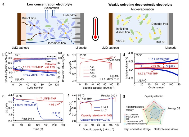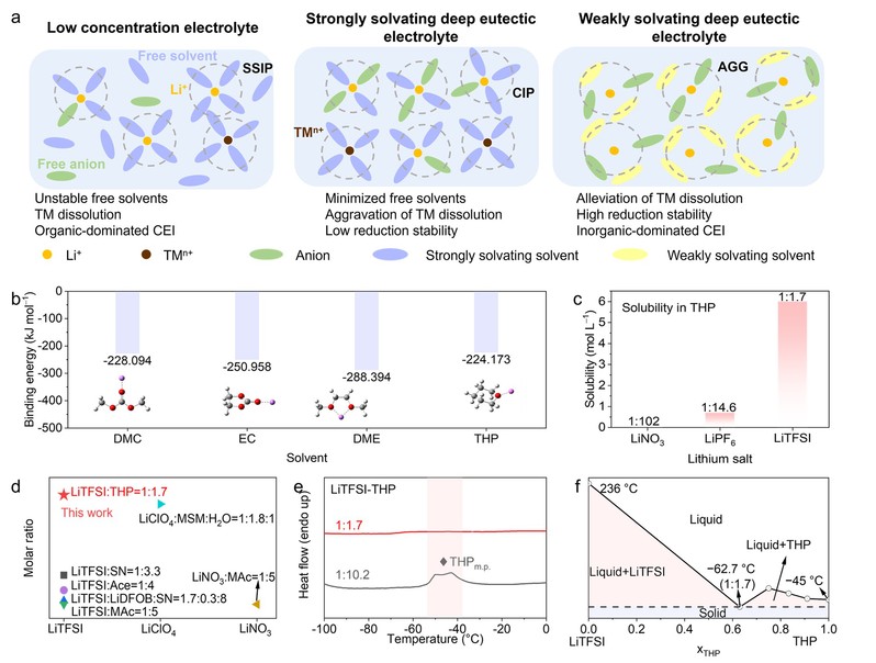 考虑到高温下电解液存在的问题,团队首先利用共晶电解液组分间的相互作用,实现对体系中不稳定游离溶剂的锚定,将电解液的液态温区拓宽为−62.7–346 °C。并在此基础上,使用弱溶剂化的THP替代常规的强极性配体溶剂,改善过渡金属溶出等副反应,提高共晶电解液与金属氧化物正极的相容性。由于组分间的阴离子效应(TFSI-THP),所构建的共晶电解液可以打破弱溶剂化所带来的低浓度限制,实现1:1.7的高锂盐/溶剂摩尔比。