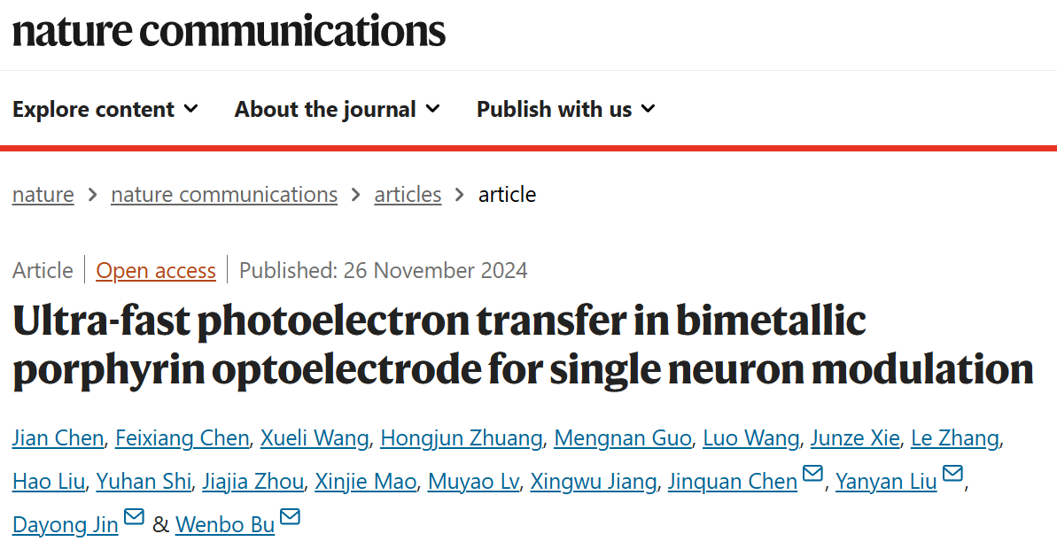 题目:Ultra-fast photoelectron transfer in bimetallic porphyrin optoelectrode for single neuron modulation