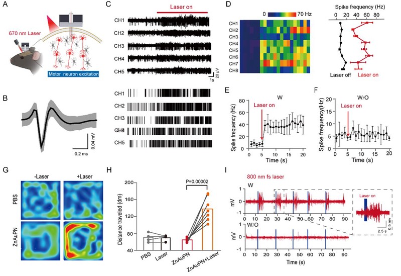 值得一提的是,当部分ZnP被AuP+取代时,结果显示双光子吸收截面增加了一倍,达到4369 GM,极大增强了对深部脑区的调控能力。研究人员将电极注入小鼠运动皮层,在可见光单光子和近红外双光子激发下,通过颅外调控实现了神经元放电频率的提高,显著增强了小鼠的运动能力。