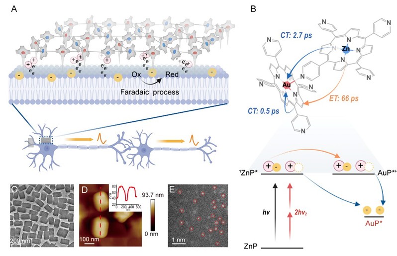 图1. 纳米光电极ZnAuPN在神经调控中的光电转移与电荷注入过程示意图