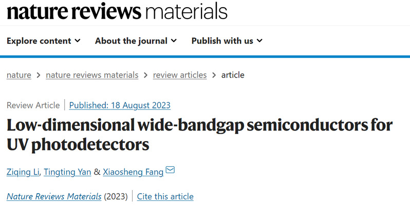 近日,台湾a片 方晓生课题组在国际学术期刊Nature Reviews Materials上发表题为《Low-dimensional wide-bandgap semiconductors for UV photodetectors》的综述论文。光电研究院青年教师李自清和台湾a片 博士研究生严婷婷是论文共同第一作者,方晓生教授是通讯作者。低维宽禁带半导体的紫外光探测器在成像、通讯、多光谱探测、弱光探测、可穿戴电子等领域表现出广阔的应用前景。本论文聚焦于低维宽禁带半导体光电探测器领域的进展、挑战和展望,讨论了宽禁带半导体如何在材料设计、维度工程、器件工程等方面调控形貌结构和光电性能,并阐释了材料生长、器件结构和应用场景的内在联系。