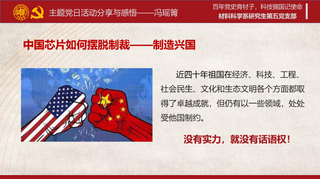 支部纪律委员冯瑶箐从美国发起对华芯片制裁和封锁的角度切入,与大家交流国产芯片面临的困境。“芯片之战”后,国家加大了对芯片领域的投入,去年各大芯片基地雨后春笋般涌现,芯片制造设备也有巨大改进。她认为,虽然我国在芯片制造领域起步较晚,但并非没有“逆袭”的一天。自主研发才是摆脱制裁的强国之路,我们应发挥专业所长,为解决芯片产业发展中的“卡脖子”问题而努力!