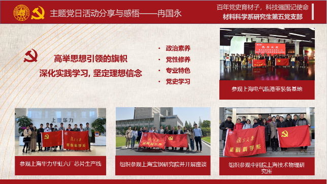 研究生第五党支部支部副书记冉国永就上海电气重装备基地、上海华力集团、上海宝钢研究院等专业参访的收获感悟做分享与交流,探讨如何巩固深化“结合特色学”教育成果。他表示,多次的实践参访活动使他受益匪浅,加深了对企业运作的了解,也为自身职业规划提供重要参考。在参观宝钢研究院时,他了解到从最初上海郊区的小厂房,到现在建有几十个分厂,宝钢研究院近年来蓬勃发展。市场印证了钢铁不是夕阳产业,材料永远是制造业的支柱,对基础材料的钻研耕耘和持续研究是绝对必要的!值此建党百年之际,作为材料人应明确目标,脚踏实地,怀凌云志,成为勇担民族复兴大任的时代新人!