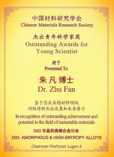 我系朱凡青年研究员荣获中国材料研究学会杰出青年科学家奖(非晶与高熵合金分会)。