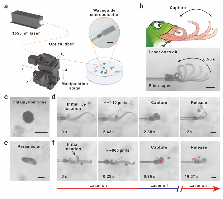 图1.光波导微型驱动器的系统设计以及对衣藻和草履虫的精准捕获。